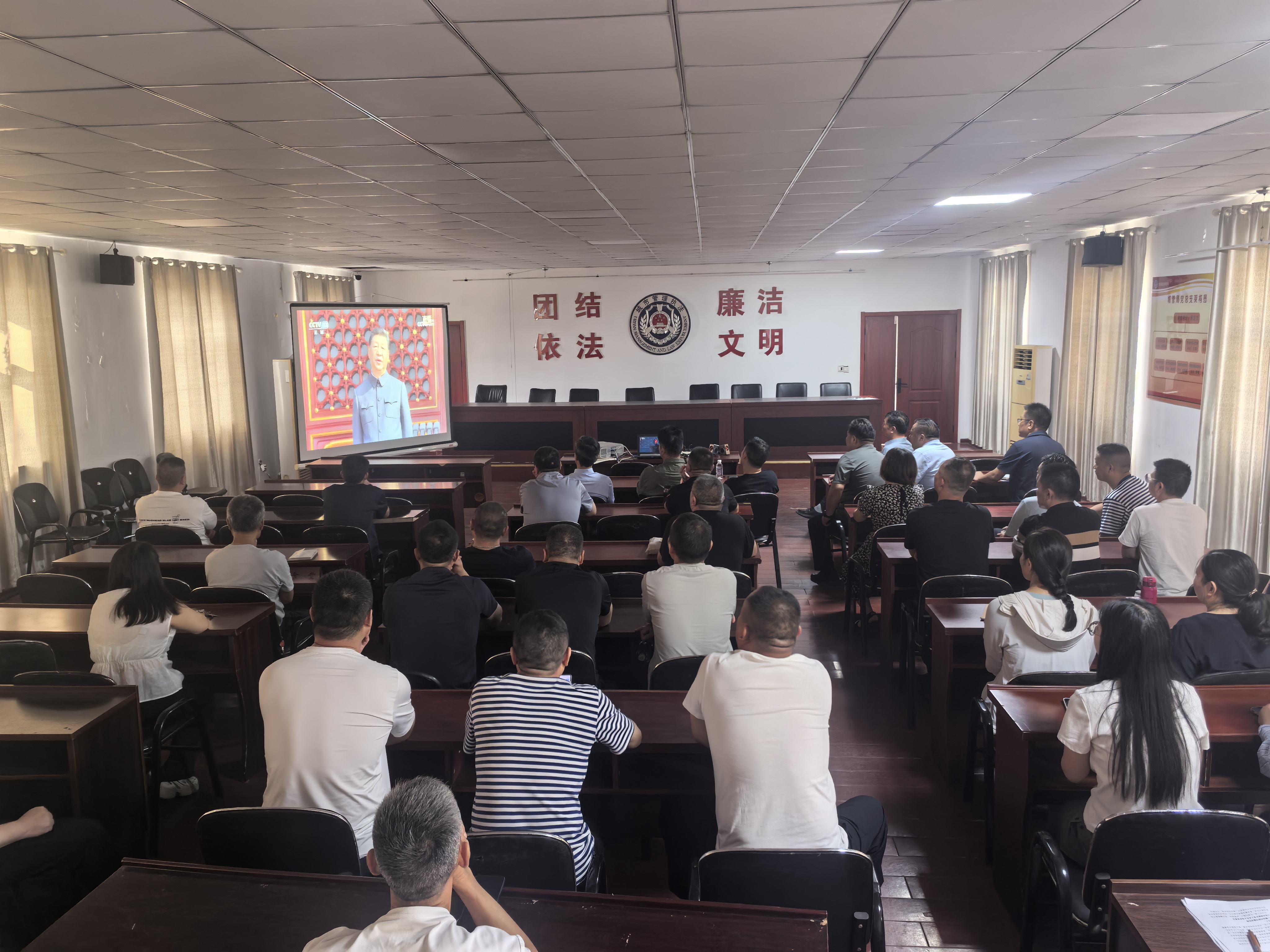 9月3日上午8點(diǎn)半,東海縣城管局黨組按照縣委組織部要求,組織領(lǐng)導(dǎo)班子成員及機(jī)關(guān)黨員干部職工來(lái)到會(huì)議室,個(gè)個(gè)精神抖擻,熱情飽滿,耐心等待閱兵式直播開(kāi)始。